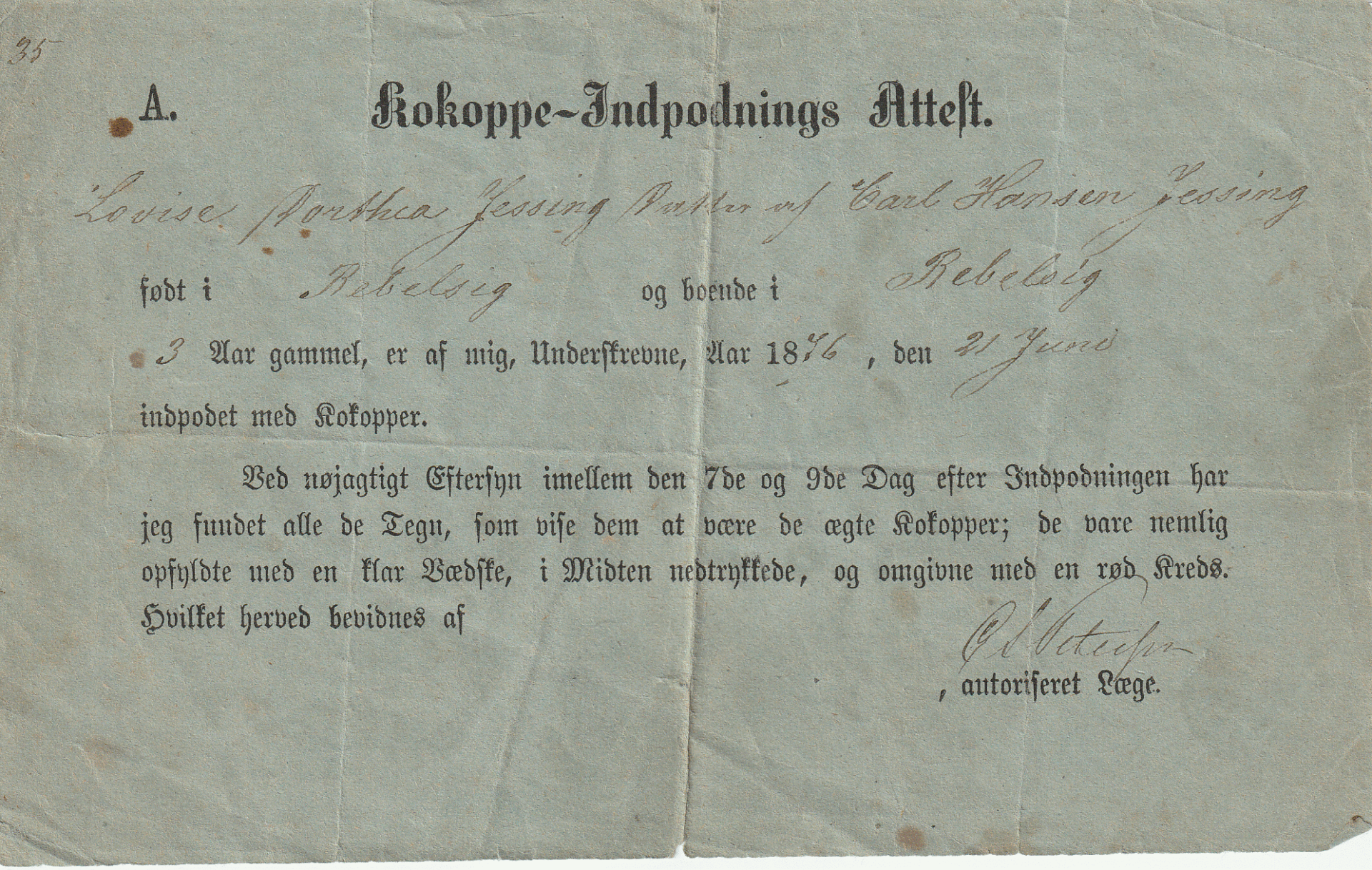 Min Bedstemors Koppeatest udstedt i 1876.