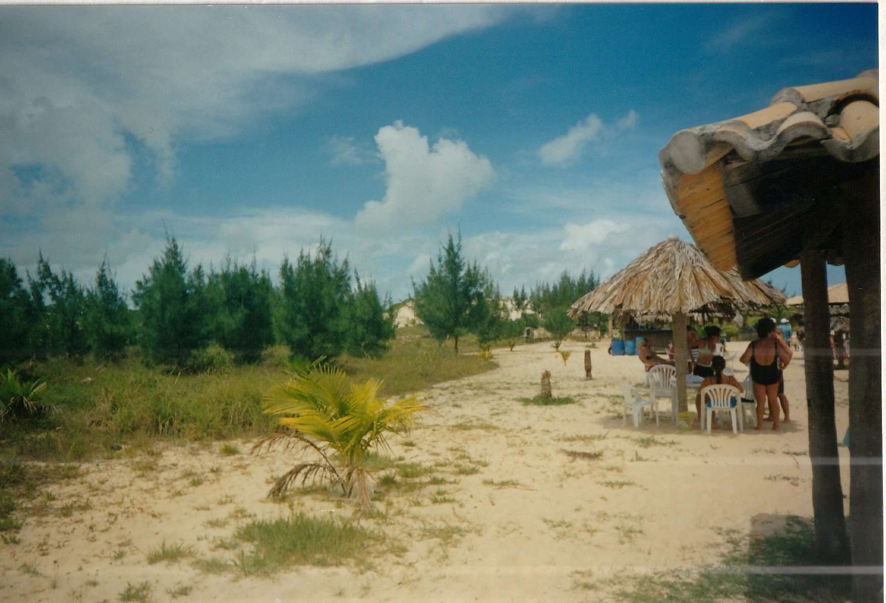 Ponte Negra strand. Man lejede et bord med parasol og stole. Jeg tror man lejede for en bestemt tid, måske en dag. Så kunne man købe mad, drinks og masser af forskellige ting som sælgere gik rundt og viste. Det kunne være smykker, duge og musik. Musikken kunne man høre fra højtalere på stranden. Meget hyggeligt. Det er jo meget glad musik der spilles på strandene.